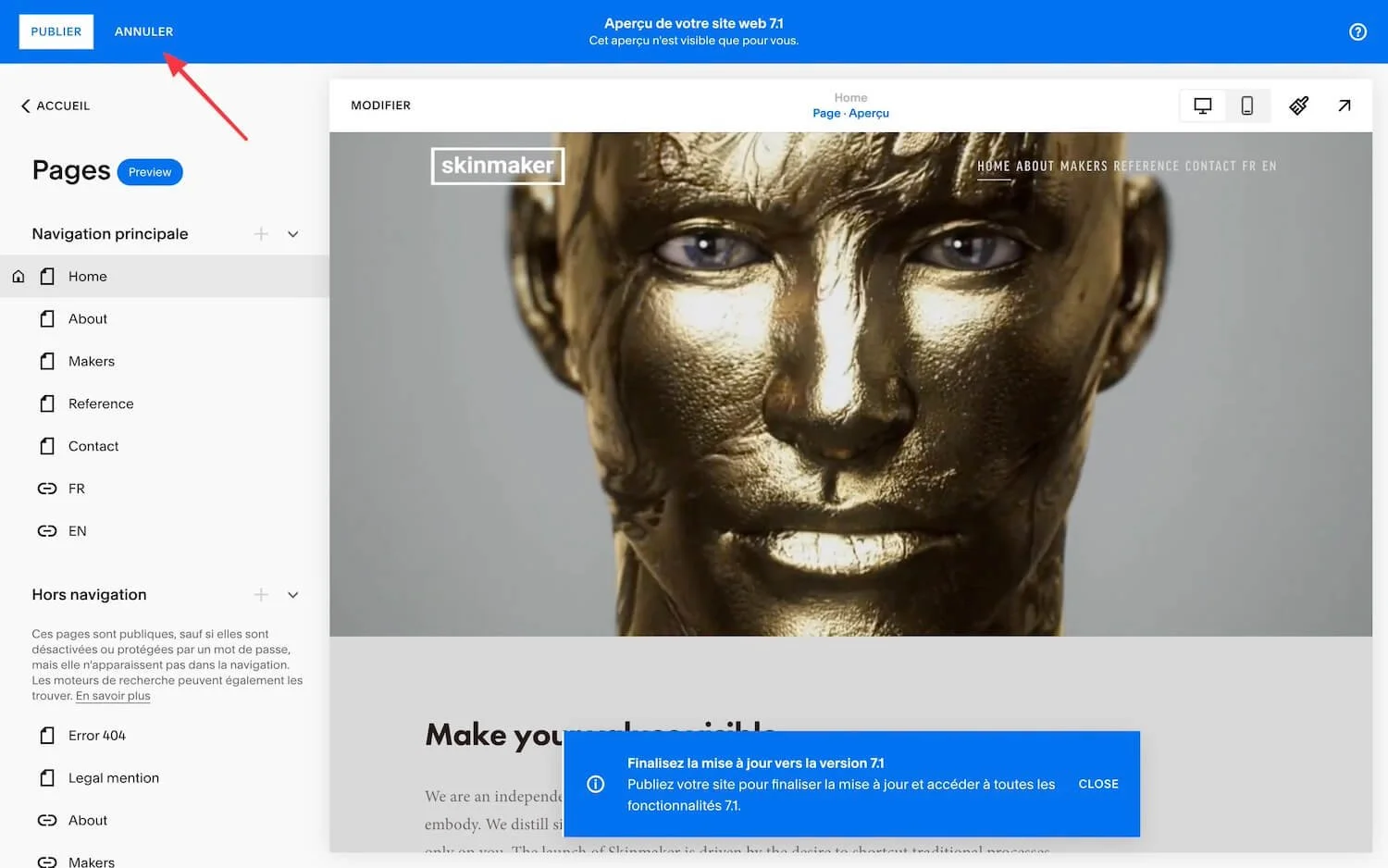 Dès que vous êtes prêt(e) à valider définitivement les changements et passer votre site vers la version 7.1, cliquez sur “Publier la mise à jour”.