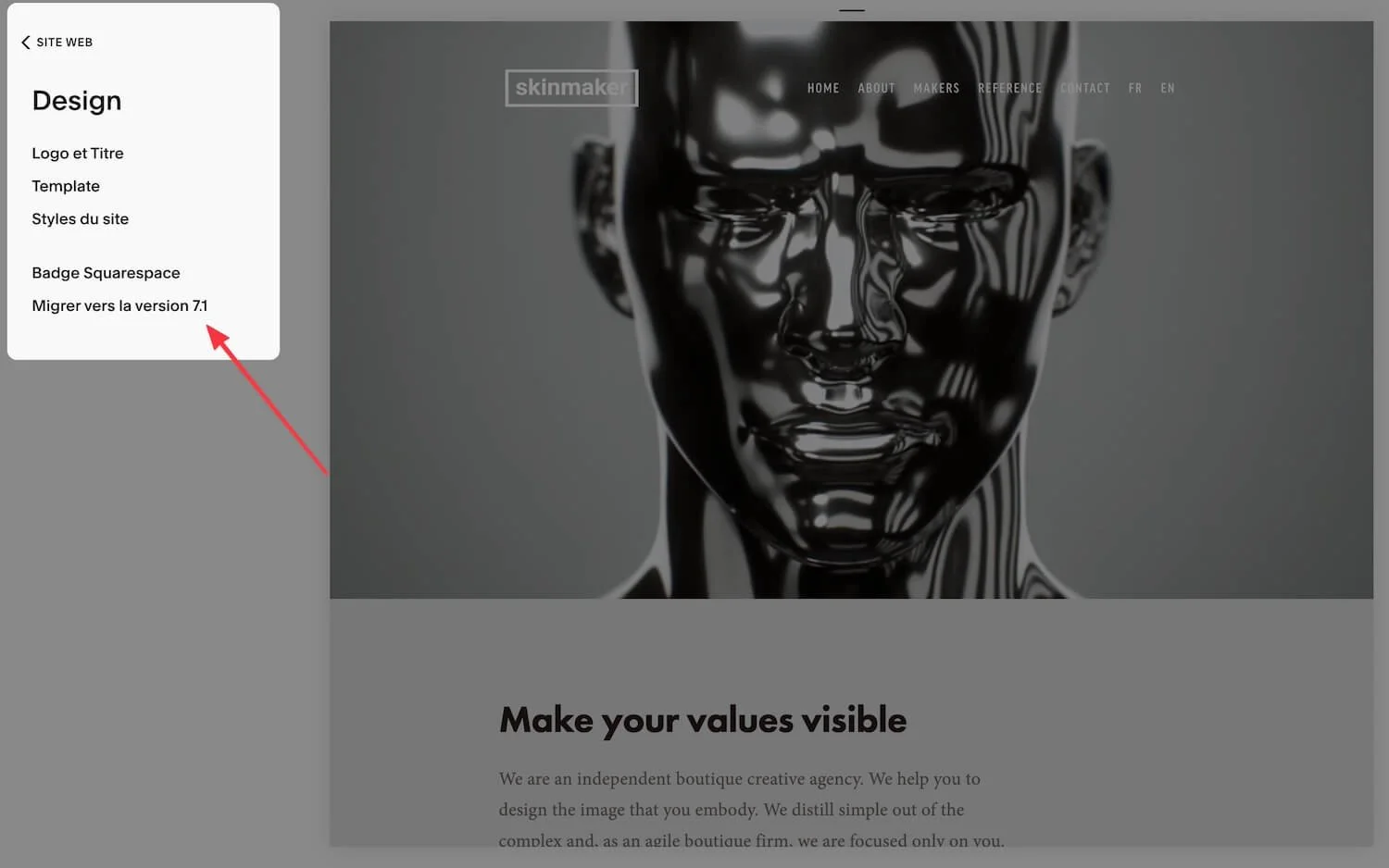 Dans le menu principal, cliquez sur “Site web” > “Design” > “Migrer vers la version 7.1”.