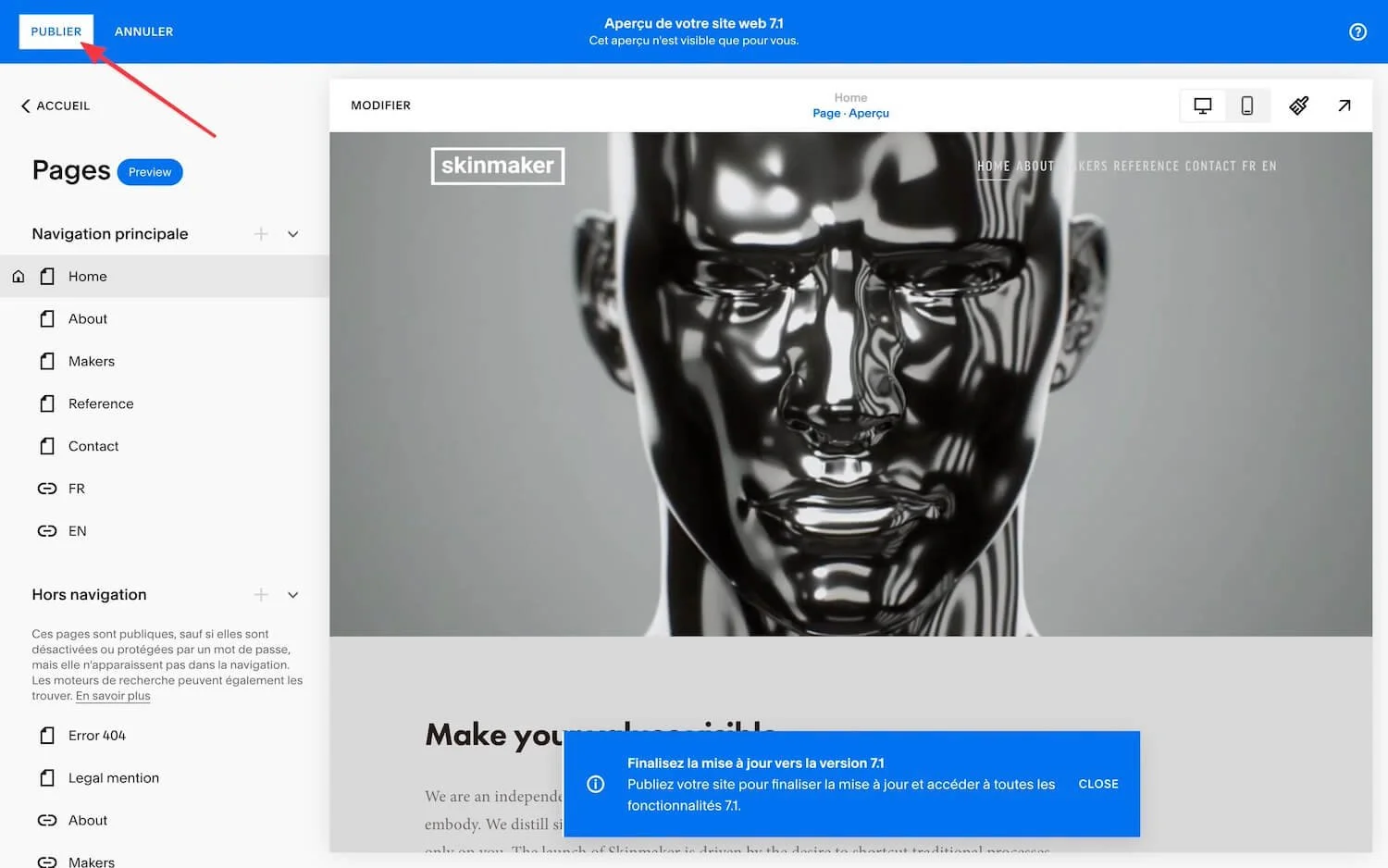Ensuite, cliquez sur “Aperçu du site en version 7.1” pour lancer la prévisualisation.