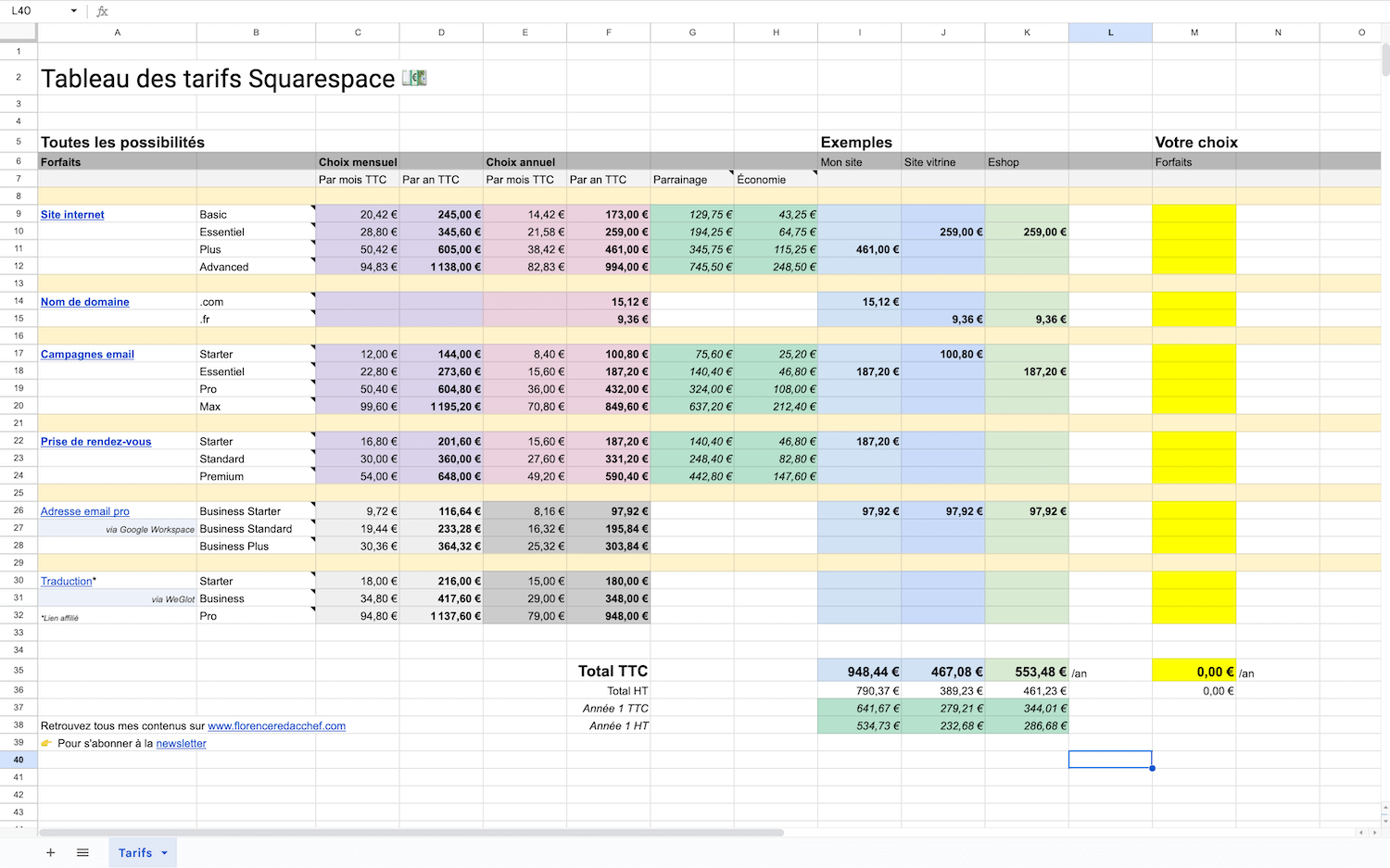 4/ Mon tableau récap des tarifs et options de Squarespace
