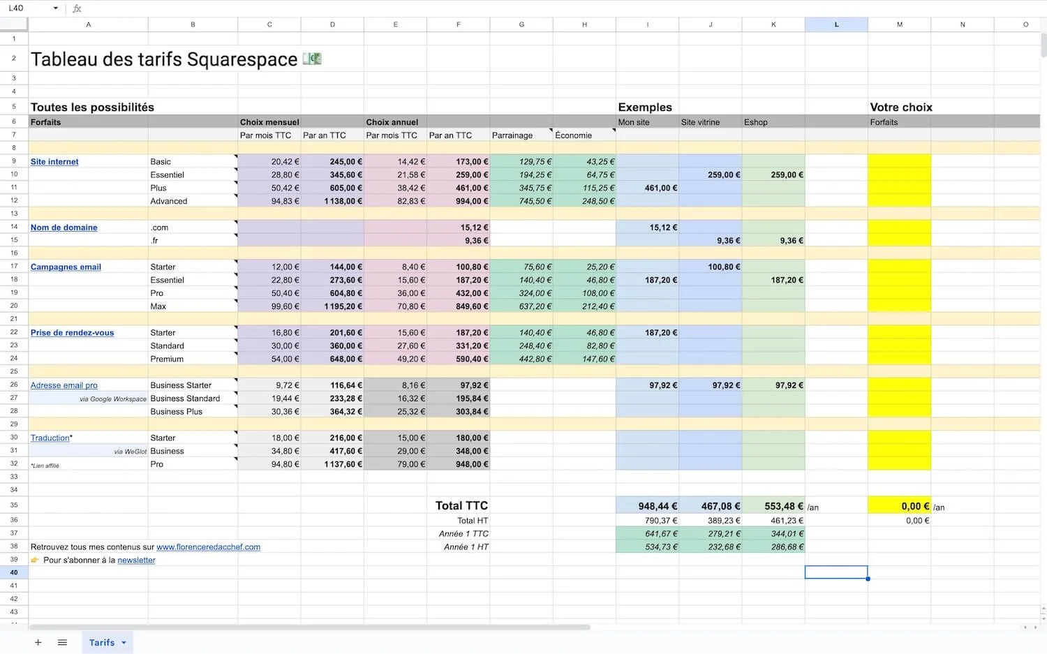 Calculez vous-même combien vous coûterait votre abonnement Squarespace avec mon tableau récap et la colonne de simulation possible.